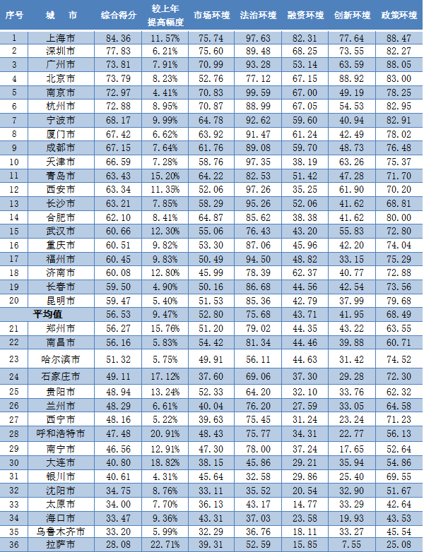 評估顯示,各參評城市政策環(huán)境和融資環(huán)境改善比較明顯,政策環(huán)境平均得分從59.34提升至68.49,其中,有24個城市上升超過10%;融資環(huán)境平均得分從38.89提升至43.71,其中,有22個城市上升超過10%。