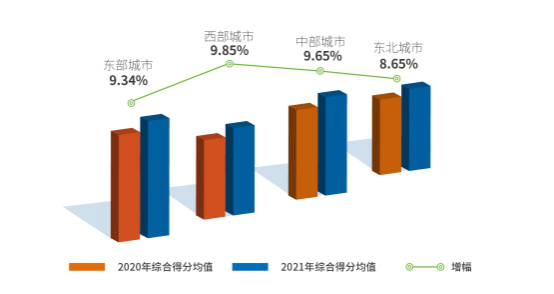 西部各參評城市2021年綜合得分均值比上次評估提升9.85%,在各區(qū)域中提升最快,區(qū)域內各城市發(fā)展環(huán)境水平差距略有縮小。成都、西安等城市緊扣區(qū)域戰(zhàn)略發(fā)展機遇期、推動產(chǎn)業(yè)轉型升級,中小企業(yè)發(fā)展環(huán)境持續(xù)優(yōu)化,與東、中部領先城市差距縮小,對西部其他城市起到一定的引領示范作用;東北地區(qū)各參評城市綜合得分均值比上次評估提升8.65%,增長率在四個區(qū)域中最低。受地區(qū)經(jīng)濟增長長期乏力、產(chǎn)業(yè)結構偏老偏重、人口持續(xù)流出等因素影響,東北城市中小企業(yè)發(fā)展較慢,發(fā)展環(huán)境整體改善勢頭不及其他地區(qū),還需要綜合施策、持續(xù)發(fā)力。