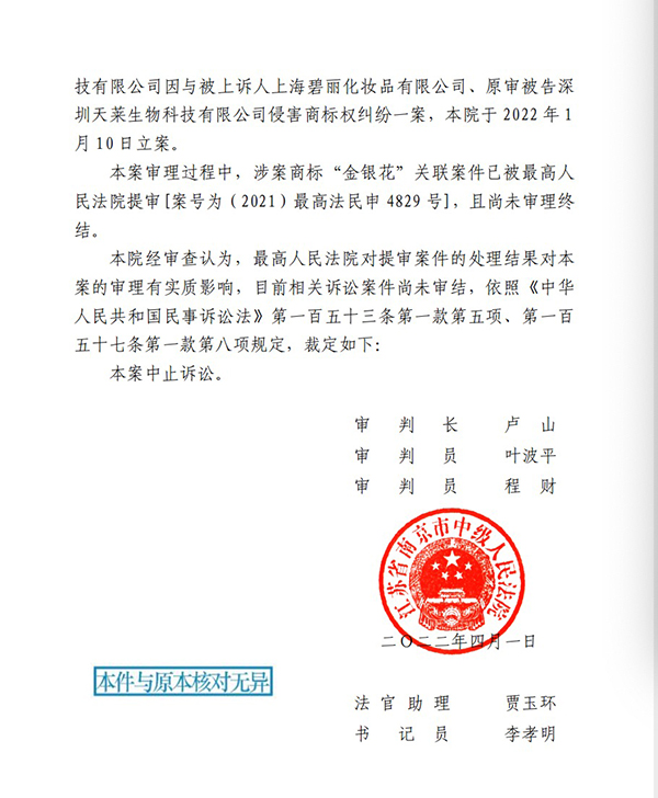 如4月1日,江蘇南京中院基于“金銀花”關(guān)聯(lián)案件已被最高法提審,決定中止審理上訴人南京三盾藥業(yè)有限公司、青島海氏海諾英諾威消毒科技有限公司與被上訴人上海碧麗化妝品有限公司案?!白罡呷嗣穹ㄔ簩?duì)提審案件的處理結(jié)果對(duì)本案的審理有實(shí)質(zhì)影響,目前相關(guān)訴訟案件尚未審結(jié),依法裁定本案中止訴訟?!辈枚〞?shū)稱(chēng)。