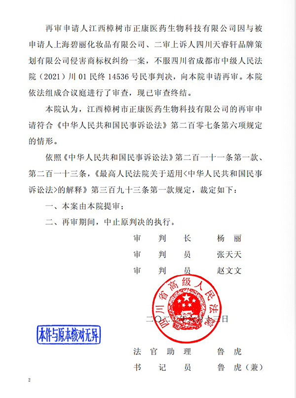 6月13日,四川高院決定對(duì)江西樟樹(shù)市正康醫(yī)藥生物科技有限公司與被申請(qǐng)人上海碧麗化妝品有限公司案申請(qǐng)?jiān)賹彴高M(jìn)行提審,并裁定,再審期間中止原判決的執(zhí)行。