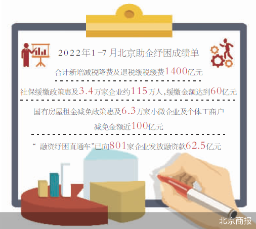 “截至8月1日,北京今年合計新增減稅降費及退稅緩稅緩費1400億元;社保緩繳政策惠及3.4萬家企業(yè)約115萬人,緩繳金額達到60億元;國有房屋租金減免政策惠及6.3萬家小微企業(yè)及個體工商戶,減免金額近100億元;“融資紓困直通車”已向801家企業(yè)發(fā)放融資款62.5億元?!贝鞣f介紹道。