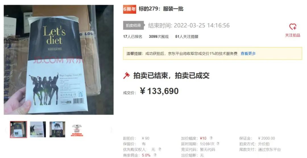 據(jù)統(tǒng)計(jì),本次拍賣專場共有1.5萬名用戶設(shè)置了關(guān)注提醒,總圍觀次數(shù)超過了44萬次,參拍用戶共3034名,累計(jì)競價次數(shù)3萬多次。其中“標(biāo)的279:服裝一批”起拍價90元,貨量超9000件,最終成交價13.37萬元,溢價率高達(dá)148倍,為本次拍賣會溢價率最高的標(biāo)的?!皹?biāo)的286:油畫一批”包括18幅創(chuàng)作精美的畫作,競價次數(shù)達(dá)到了761次,成了本場拍賣會“最受買家青睞”的拍品。