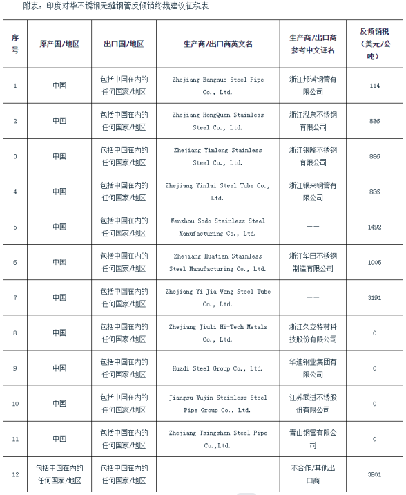 2022年9月23日,印度商工部發(fā)布公告,對原產于或進口自中國的直徑小于等于6英寸的不銹鋼無縫鋼管(Stainless-steel Seamless Tubes & Pipes)作出反傾銷終裁,建議對中國的涉案產品征收為期5年的反傾銷稅,稅額為0~3801美元/公噸,征稅詳情見附表(印度對華不銹鋼無縫鋼管反傾銷終裁建議征稅表)。涉案產品為無論是采用熱擠壓工藝或熱穿孔工藝制造,無論是作為熱加工管或冷加工管售賣,包括缺陷品、非打印品或二級品在內的、公稱直徑不超過6英寸或與其相當?shù)钠渌嬃繂挝坏牟讳P鋼無縫鋼管,涉及印度海關編碼7304項下的產品。