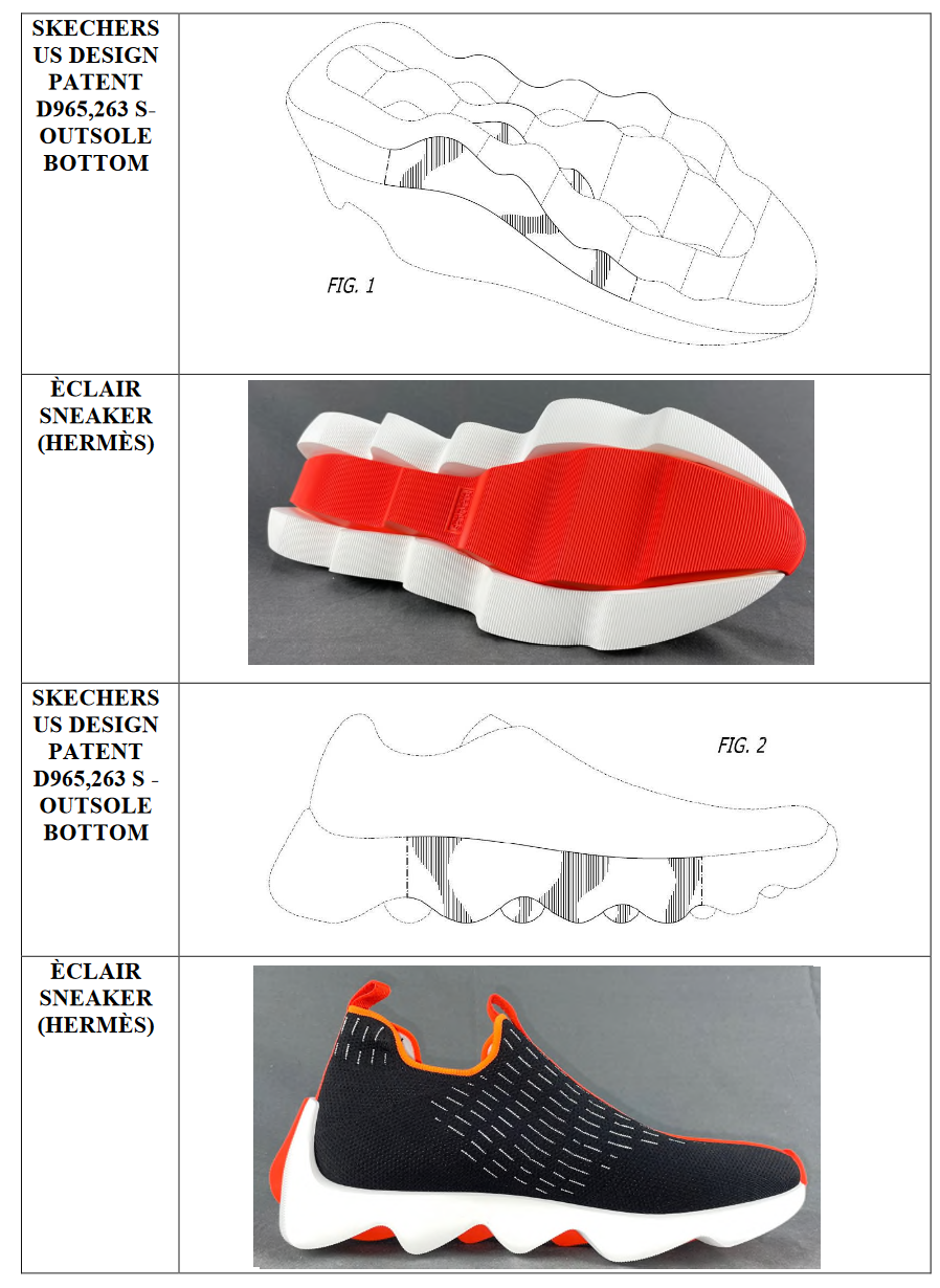 斯凱奇指出,愛馬仕2022年推出的éclair和Envol兩款鞋履中,鞋底使用的設(shè)計元素侵犯了斯凱奇Massage Fit鞋底的多項專利。