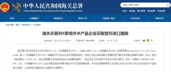海關(guān)總署網(wǎng)站10月26日消息,海關(guān)部門在對(duì)厄瓜多爾FRIGOPESCA C.A.(注冊(cè)編號(hào)為3976)、CAMAR-EXPO S.A.(注冊(cè)編號(hào)為7863)和俄羅斯Oktyabrskiy-1 Co LLC fish plant № 2(注冊(cè)編號(hào)為CH-734)3家輸華水產(chǎn)品企業(yè)進(jìn)行視頻檢查時(shí),發(fā)現(xiàn)上述企業(yè)新冠肺炎疫情防控嚴(yán)重不符合聯(lián)合國糧農(nóng)組織(FAO)發(fā)布《新冠肺炎(COVID-19):防止新冠肺炎在食品食品企業(yè)傳播的指南》,食品安全衛(wèi)生控制不符合中方進(jìn)口要求;另外,印度M/s RUPSHA FISH PVT. LTD.(注冊(cè)編號(hào)為1319)企業(yè)未能在規(guī)定時(shí)限內(nèi)配合中方完成視頻檢查。中方?jīng)Q定暫停接受上述4家企業(yè)自2022年10月26日后啟運(yùn)水產(chǎn)品的進(jìn)口申報(bào)。上述信息已通報(bào)各出口國官方主管部門。(汪定強(qiáng))