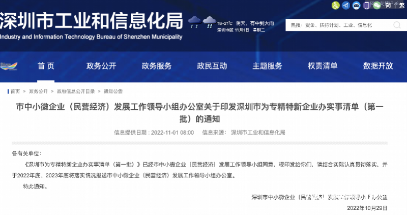 11月1日是“深圳企業(yè)家日”。這一天,深圳也為專精特新企業(yè)送上了一份專屬“大禮包”。深圳市中小微企業(yè)(民營(yíng)經(jīng)濟(jì))發(fā)展工作領(lǐng)導(dǎo)小組辦公室發(fā)布了《關(guān)于印發(fā)深圳市為專精特新企業(yè)辦實(shí)事清單(第一批)的通知》(以下簡(jiǎn)稱《通知》)?!锻ㄖ繁硎荆瑸閷>匦缕髽I(yè)辦實(shí)事清單旨在加強(qiáng)深圳市專精特新企業(yè)(含專精特新“小巨人”企業(yè)和專精特新中小企業(yè))培育工作,支持專精特新企業(yè)高質(zhì)量發(fā)展,引導(dǎo)更多中小企業(yè)走專精特新發(fā)展之路。