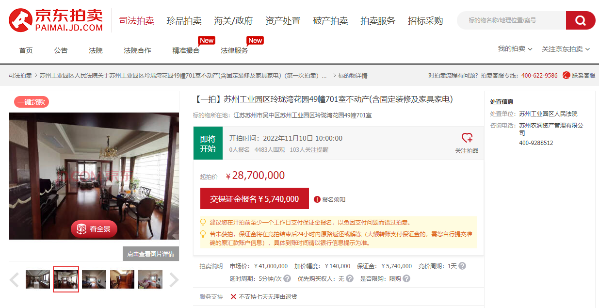 說起玲瓏灣,稍微了解蘇州房市的人都清楚,這里一直是蘇州普通住宅單價(jià)的天花板。該小區(qū)位于蘇州工業(yè)園區(qū),得天獨(dú)厚的地理位置,可以把金雞湖的湖景盡收眼底,經(jīng)常出現(xiàn)在國內(nèi)影視劇中,可謂是園區(qū)的明星樓盤。本次蘇州法拍節(jié)期間開拍的一套約300平米的大平層,裝修奢華,站在陽臺(tái)即可飽覽金雞湖美景,市場評(píng)估價(jià)4100萬元,將在11月10日以2870萬元進(jìn)行拍賣。