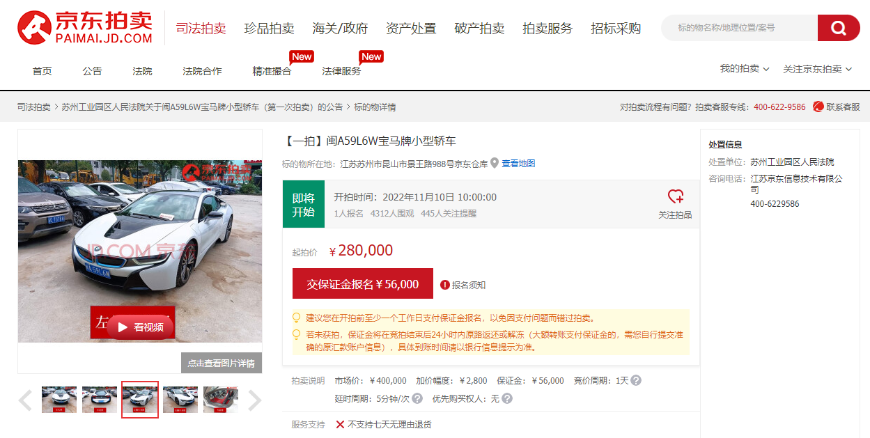 由蘇州工業(yè)園區(qū)法院處置的一臺(tái)2015年掛牌的寶馬i8,行駛里程約8萬公里,起拍價(jià)僅28萬元。寶馬i8在當(dāng)年上市之初,號(hào)稱是唯一量產(chǎn)的概念車型,要重新定義城市移動(dòng)出行方式,其超酷炫的外觀設(shè)計(jì)仿佛從未來穿越而來,博得一眾車友的喜愛。據(jù)了解,該臺(tái)車因融資租賃糾紛被法院查封拍賣,已吸引了4300余人的圍觀,花落誰家讓人期待。