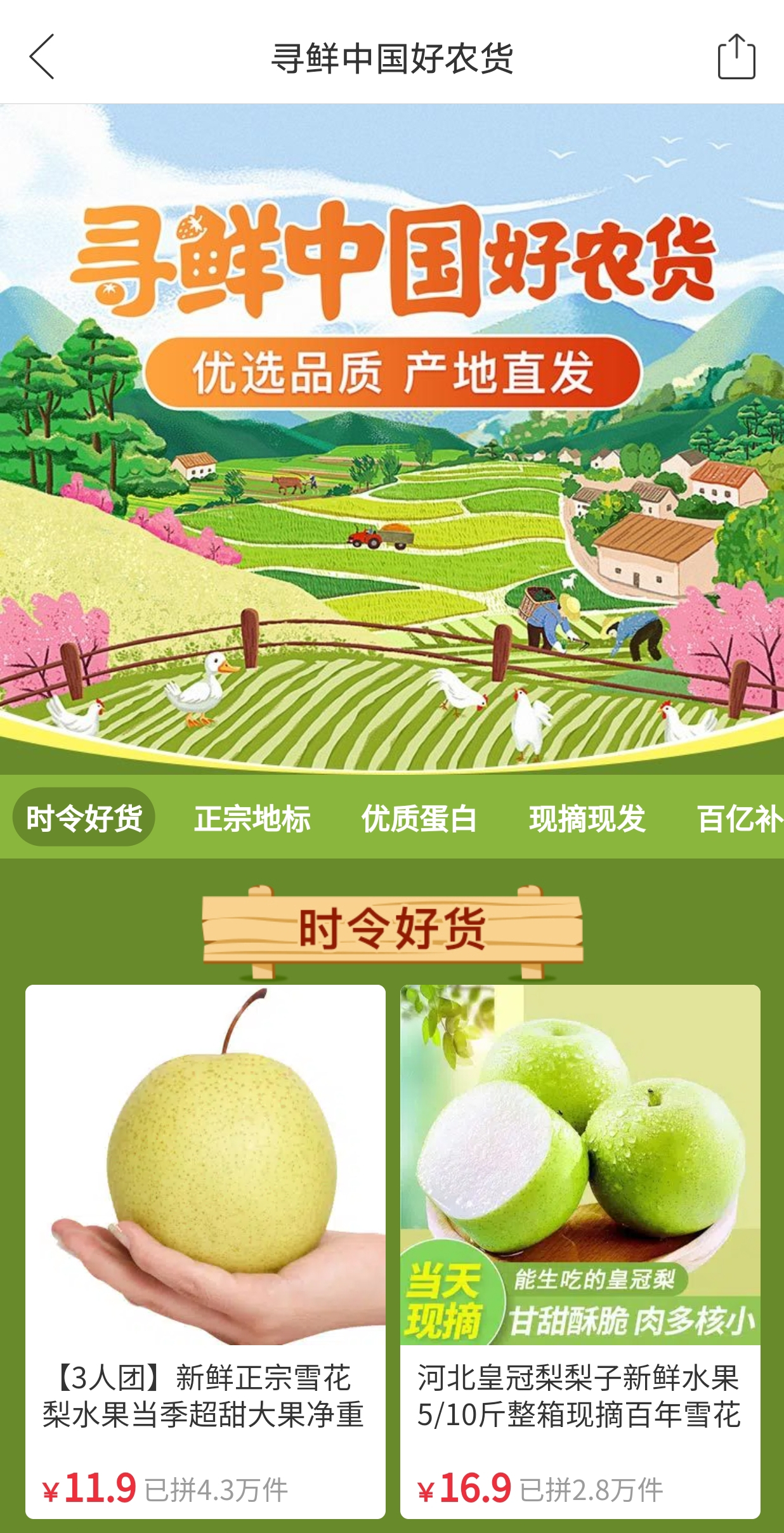 活動期間,消費者打開拼多多app,搜索“尋鮮中國”“多多好農(nóng)貨”“好農(nóng)貨”等關鍵詞,即可直達專區(qū),選購時令地標農(nóng)貨。