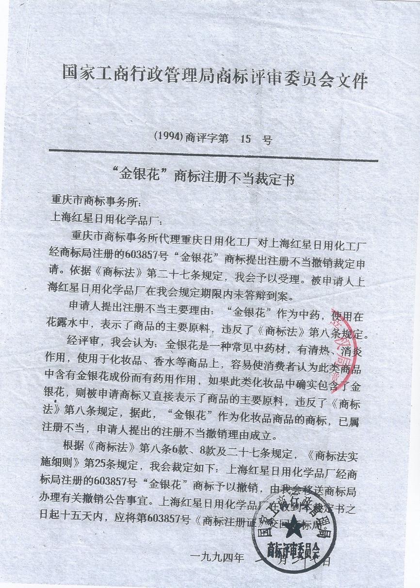 申請(qǐng)人詩(shī)妍公司向法庭展示了(1994)商評(píng)字第15號(hào)“金銀花”商標(biāo)注冊(cè)不當(dāng)裁定書(shū)。這份裁定書(shū)載明,重慶日用化工廠對(duì)上海紅星日用化工廠(金銀花商標(biāo)的注冊(cè)人)提出了商標(biāo)注冊(cè)不當(dāng)撤銷(xiāo)申請(qǐng),當(dāng)時(shí)的國(guó)家工商行政管理局商標(biāo)評(píng)審委員會(huì)作出裁定:對(duì)該商標(biāo)予以撤銷(xiāo)。