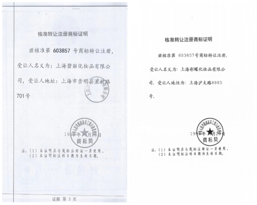 碧麗公司答辯稱(chēng),彩蝶廠、紅星廠和碧麗公司是一套班子一套人馬,“核心都是這些人。”該公司確實(shí)曾向法庭提交被指(變?cè)欤┑纳虡?biāo)轉(zhuǎn)讓證,但最終未影響法庭審判。