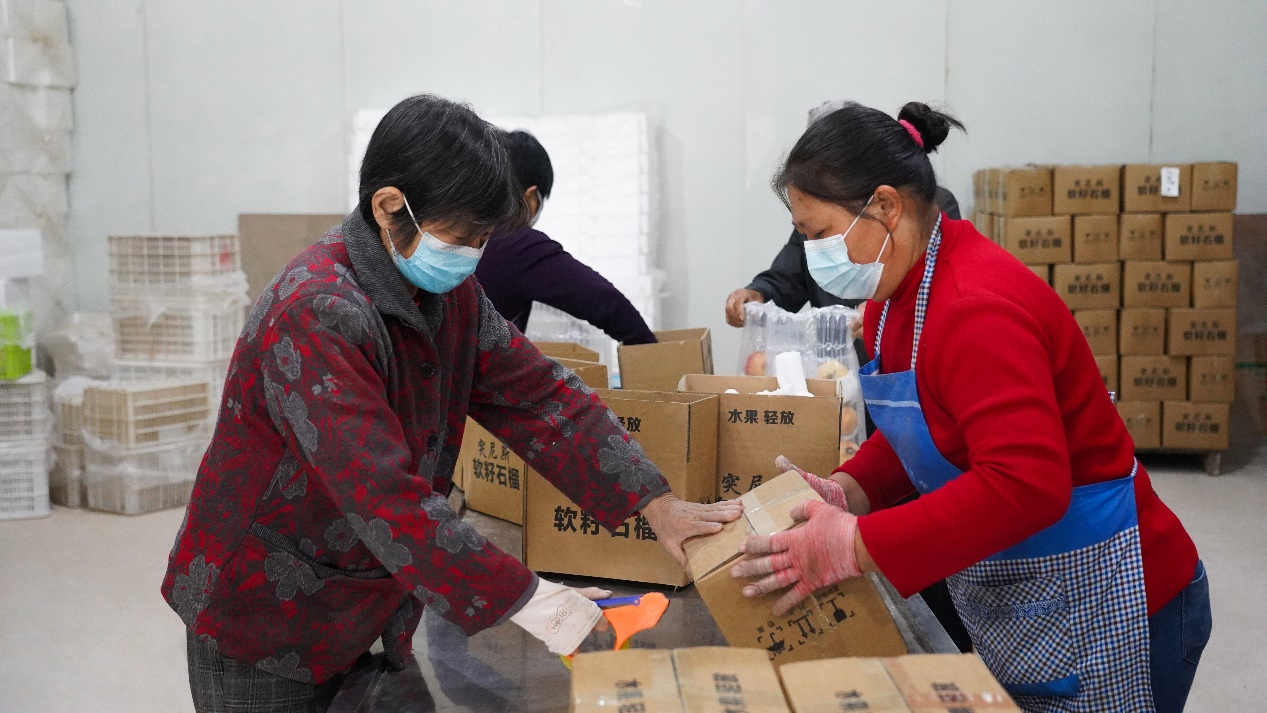 “上了網(wǎng)”的河陰石榴,不僅打開(kāi)了銷(xiāo)路,村民的收入也翻了幾番。倉(cāng)庫(kù)里,正在打包石榴的賈大姐很健談:“我們是南水北調(diào)的移民,十幾年前從南陽(yáng)淅川縣搬到了滎陽(yáng)。現(xiàn)在在石榴園里幫忙,三個(gè)月的工資快比以前一年賺得多了!”