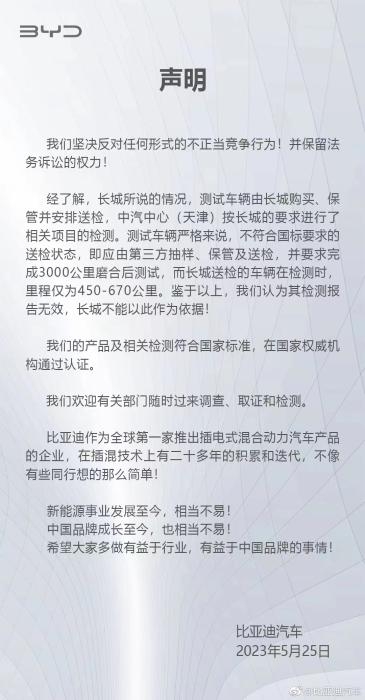 比亞迪稱,經(jīng)了解,長城所說的情況,測試車輛由長城購買、保管并安排送檢,中汽中心(天津) 按長城的要求進行了相關(guān)項目的檢測。測試車輛嚴格來說,不符合國標要求的送檢狀態(tài),即應由第三方抽樣、保管及送檢,并要求完成3000公里磨合后測試,而長城送檢的車輛在檢測時,里程僅為450-670公里。鑒于以上,比亞迪認為其檢測報告無效,長城不能以此作為依據(jù)。
