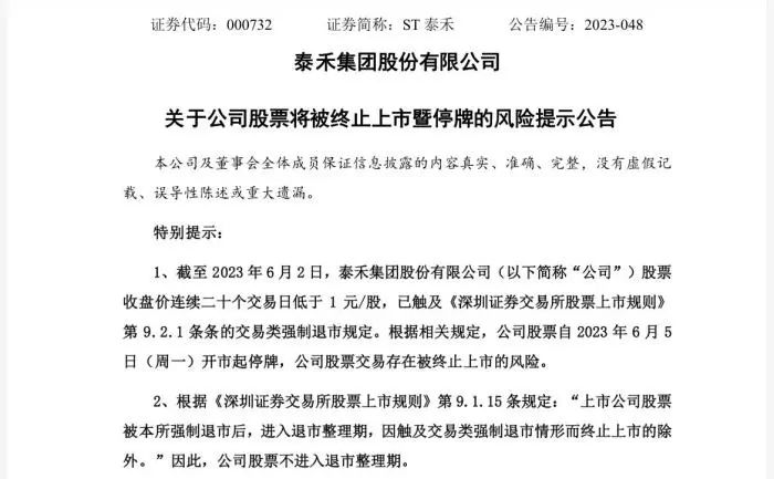 6月2日晚間,ST泰禾公告,截至當(dāng)日,公司股票收盤(pán)價(jià)連續(xù)20個(gè)交易日低于1元/股,已觸及交易類(lèi)強(qiáng)制退市規(guī)定。根據(jù)相關(guān)規(guī)定,公司股票自6月5日開(kāi)市起停牌,公司股票交易存在被終止上市的風(fēng)險(xiǎn)。