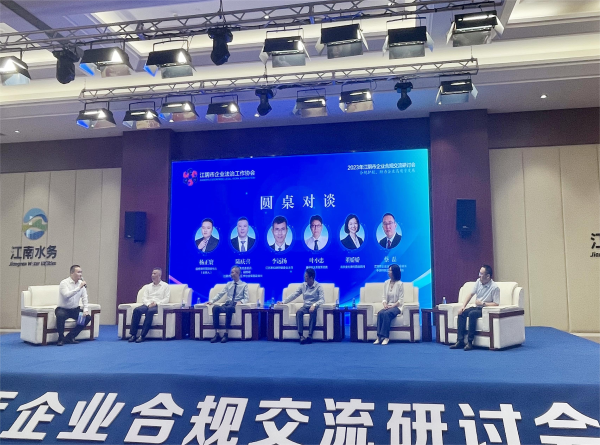 在合規(guī)主題圓桌對(duì)談環(huán)節(jié),賽尼爾法務(wù)智庫(kù)總裁葉小忠、北京金杜律所高級(jí)顧問(wèn)董嬌嬌、江南水務(wù)副總經(jīng)理陸慶喜、江蘇泰和律所管委會(huì)主任李遠(yuǎn)揚(yáng)、江陰市企業(yè)法治工作協(xié)會(huì)會(huì)長(zhǎng)蔡磊五位嘉賓,分別立足各自領(lǐng)域,圍繞會(huì)議主題深入探討,交流思想、分享經(jīng)驗(yàn)。
