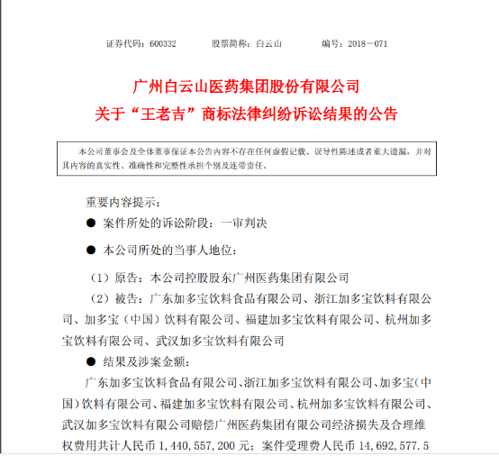 據(jù)廣藥集團(tuán)子公司白云山2018年7月公告,廣東高院關(guān)于“王老吉”商標(biāo)法律糾紛案件的一審《民事判決書(shū)》顯示,廣東加多寶飲料食品有限公司、浙江加多寶飲料有限公司、加多寶(中國(guó))飲料有限公司、福建加多寶飲料有限公司、杭州加多寶飲料有限公司、武漢加多寶飲料有限公司(合稱為“六加多寶”)被判賠償廣藥集團(tuán)經(jīng)濟(jì)損失及合理維權(quán)費(fèi)用共計(jì)人民幣14.41億元。