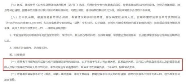 比如青海省煙草專賣局(公司)于7月13日發(fā)布的2023年高校畢業(yè)生招聘公告,同樣明確提出:應(yīng)聘人員不得報考與本人有夫妻關(guān)系、直系血親關(guān)系、三代以內(nèi)旁系血親關(guān)系以及近姻親關(guān)系的人員所屬市州局(公司)相關(guān)崗位。應(yīng)聘人員的直系親屬、三代以內(nèi)旁系血親以及近姻親有在青海煙草系統(tǒng)工作的,報名時須如實說明。故意隱瞞不報的,一經(jīng)查實,直接取消考試或錄用資格;已經(jīng)錄用的,依法解除勞動關(guān)系。