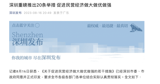 近期,各地促進(jìn)民營經(jīng)濟(jì)發(fā)展的政策舉措密集出臺,深圳也密集推出系列政策舉措。8月7日,深圳三大優(yōu)化營商環(huán)境工作方案正式發(fā)布,立足于市場化、法治化、國際化加快營造一流營商環(huán)境。據(jù)深圳發(fā)布16日消息,《關(guān)于促進(jìn)民營經(jīng)濟(jì)做大做優(yōu)做強的若干措施》(下稱《若干措施》)已經(jīng)深圳市委、市政府同意并正式印發(fā),提出20項舉措,加速釋放民營企業(yè)發(fā)展動能。