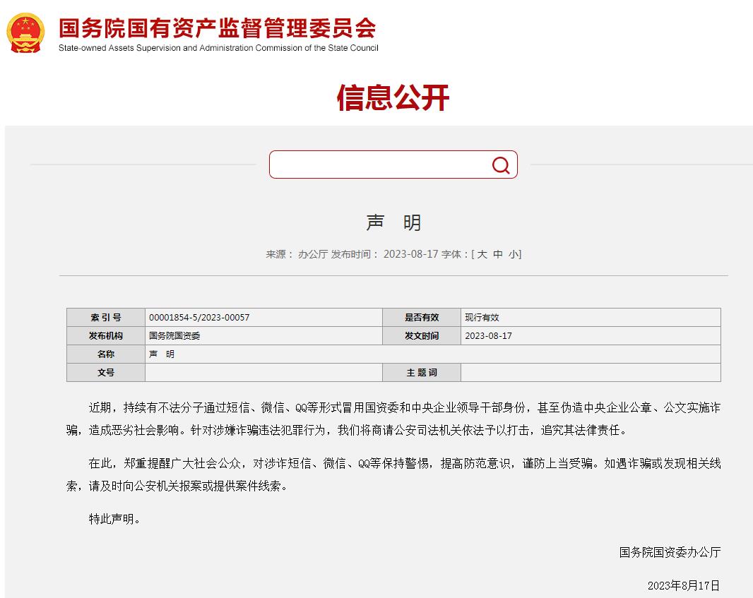 國務(wù)院國有資產(chǎn)監(jiān)督管理委員會網(wǎng)站8月17日發(fā)布的聲明內(nèi)容截圖