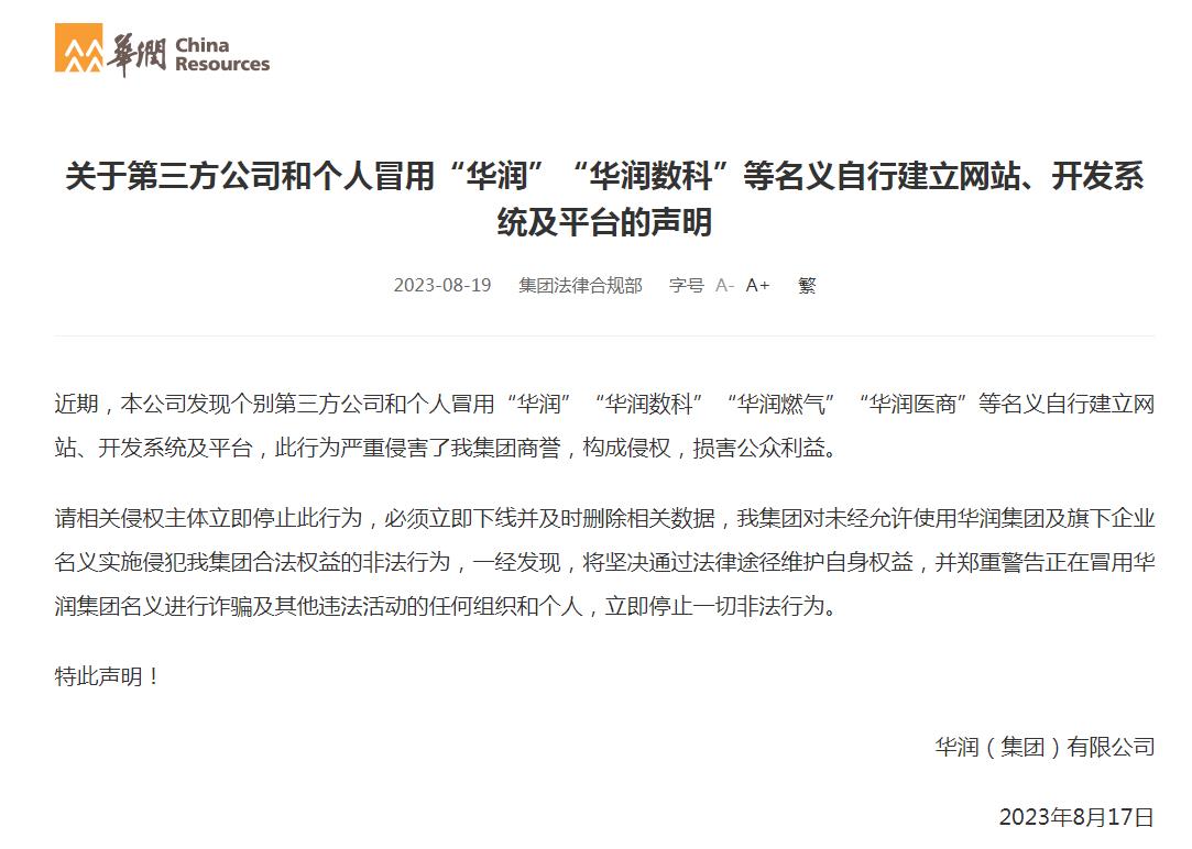 華潤(集團(tuán))有限公司(以下簡稱“華潤集團(tuán)”)的聲明稱,近期,公司發(fā)現(xiàn)個(gè)別第三方公司和個(gè)人冒用“華潤”“華潤數(shù)科”“華潤燃?xì)狻薄叭A潤醫(yī)商”等名義自行建立網(wǎng)站、開發(fā)系統(tǒng)及平臺,此行為嚴(yán)重侵害了華潤集團(tuán)商譽(yù),構(gòu)成侵權(quán),損害公眾利益。