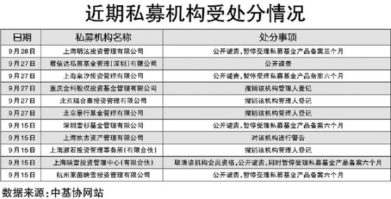 據(jù)《經(jīng)濟參考報》記者統(tǒng)計,今年8月初至9月底,中基協(xié)網(wǎng)站公布針對私募機構(gòu)的紀律處分決定書38張、針對相關(guān)個人的紀律處分決定書88張,合計超120張。業(yè)內(nèi)人士分析認為,針對私募行業(yè)相關(guān)問題的處分力度較之前明顯加強。此前的6月至7月,中基協(xié)針對私募機構(gòu)的紀律處分決定書僅有3張,針對相關(guān)個人的紀律處分決定書也僅有4張。