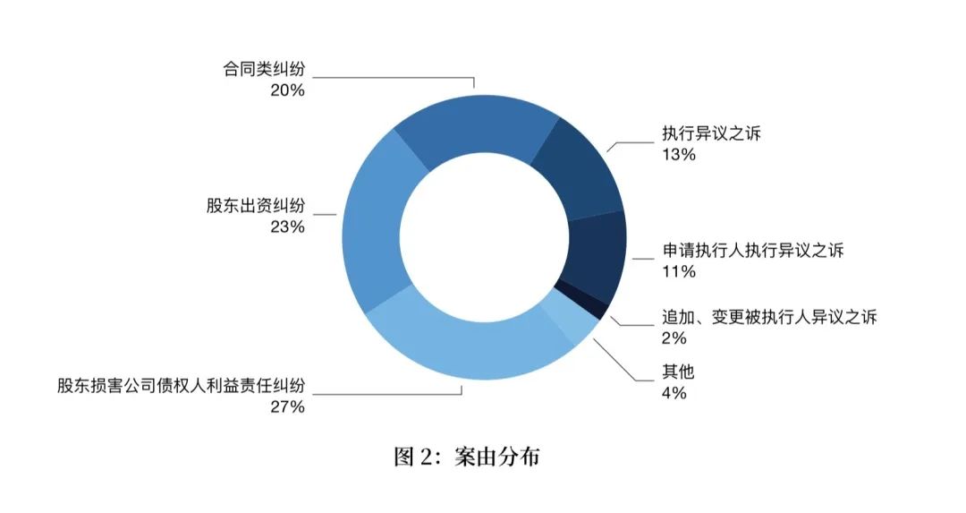 從案由可見,股東損害公司債權(quán)人利益責(zé)任糾紛、股東出資糾紛在涉股東出資責(zé)任案件中較為多見,合計占比50%。因2016年8月《最高人民法院關(guān)于民事執(zhí)行中變更、追加當(dāng)事人若干問題的規(guī)定》(2020年12月修訂)《九民紀(jì)要》等規(guī)范性文件先后發(fā)布,近四年公司債權(quán)人起訴請求出資屆期或尚未屆期的股東對公司不能清償?shù)膫鶆?wù)承擔(dān)補(bǔ)充賠償責(zé)任的情況日益增多,由此引發(fā)的與股東出資責(zé)任有關(guān)的執(zhí)行類異議之訴數(shù)量居高不下,在涉股東出資責(zé)任案件中合計占比26%。