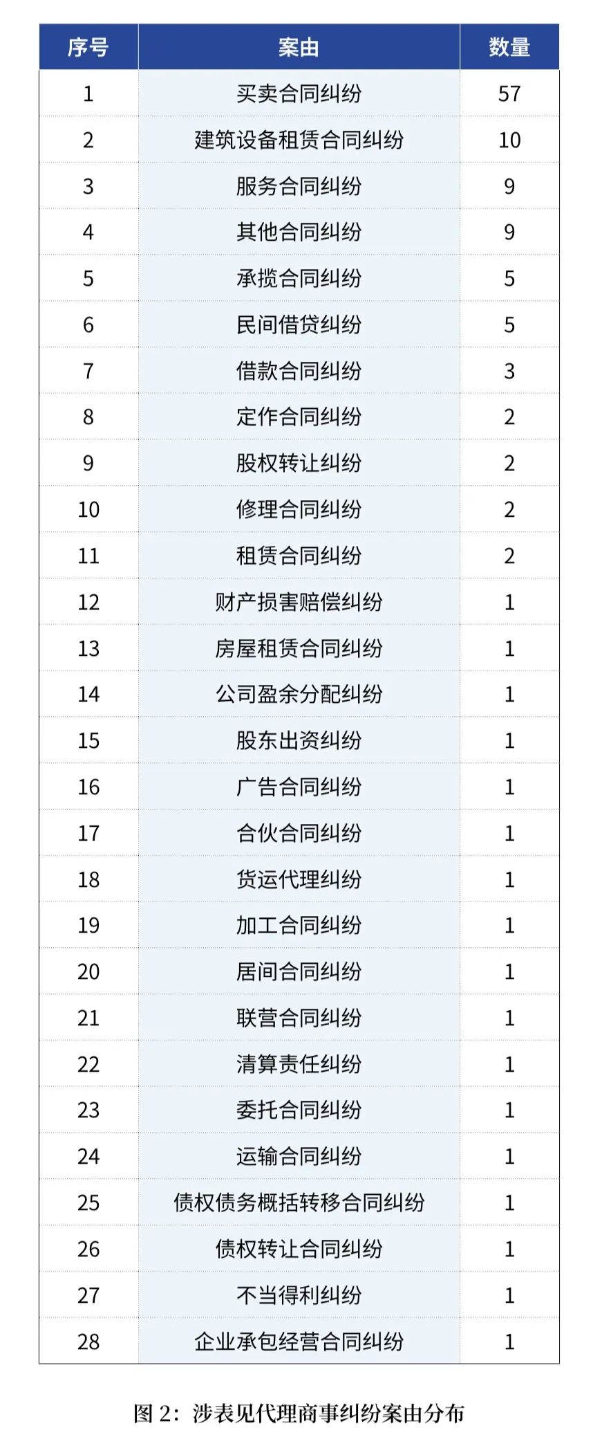 2019年至2022年審結(jié)的涉表見代理商事糾紛案件共涉及28個(gè)案由,其中買賣合同糾紛案件為57件,占比46.34%,接近總數(shù)量的一半;建筑設(shè)備租賃合同糾紛案件為10件,占比8.13%;服務(wù)合同糾紛案件、其他合同糾紛案件各為9件,分別占比7.32%,此四類合同,分別占結(jié)案數(shù)的前三位。(如圖2)