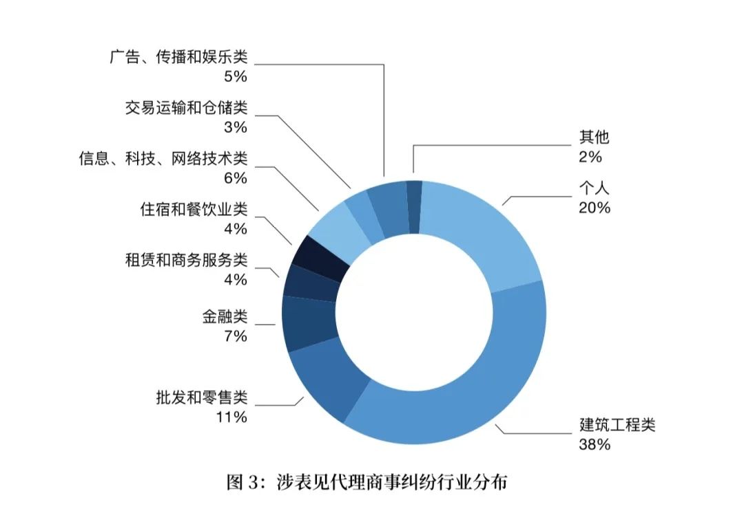 123件涉表見代理商事糾紛案件中,涉訴主體共有327名,其中公司為260家,占79.51%,個(gè)人為67人,占20.49%。在260家公司中,根據(jù)行業(yè)分類,建筑工程類有125家,批發(fā)和零售類有36家,金融類有22家,信息、科技、網(wǎng)絡(luò)技術(shù)類有19家,住宿和餐飲業(yè)有22家,信息傳輸、信息技術(shù)服務(wù)業(yè)有18家,租賃和商務(wù)服務(wù)有14家,建筑業(yè)有12家,交通運(yùn)輸、倉儲(chǔ)業(yè)有9家,娛樂業(yè)有6家,其他行業(yè)有6家。(如圖3)