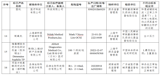 據(jù)國(guó)家藥監(jiān)局網(wǎng)站消息,為加強(qiáng)醫(yī)療器械監(jiān)督管理,保障醫(yī)療器械產(chǎn)品質(zhì)量安全有效,國(guó)家藥監(jiān)局組織對(duì)呼吸道用吸引導(dǎo)管(吸痰管)、生物反饋治療設(shè)備等11個(gè)品種進(jìn)行產(chǎn)品質(zhì)量監(jiān)督抽檢,發(fā)現(xiàn)16批(臺(tái))產(chǎn)品不符合標(biāo)準(zhǔn)規(guī)定。