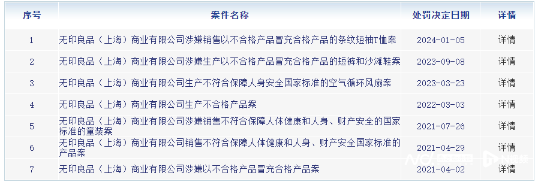 此外,南都·灣財(cái)社記者發(fā)現(xiàn),此次也并非無印良品(上海)商業(yè)有限公司首次因?yàn)楫a(chǎn)品質(zhì)量問題被罰。上海市市場(chǎng)監(jiān)督管理局顯示,2021年4月2日至2024年1月5日期間,無印良品(上海)商業(yè)有限公司共有7次因生產(chǎn)、銷售不合格產(chǎn)品,被多次處罰的案例。
