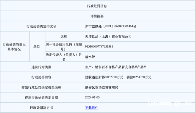 近日,南都·灣財(cái)社記者從上海市市場(chǎng)監(jiān)督管理局獲悉,無印良品(上海)商業(yè)有限公司因銷售以不合格產(chǎn)品冒充合格產(chǎn)品,違反產(chǎn)品質(zhì)量法相關(guān)規(guī)定。被靜安區(qū)市場(chǎng)監(jiān)督管理局罰款2517.5元,沒收違法所得377.1元。