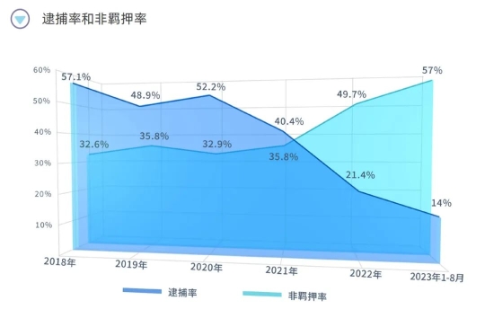 拘留和逮捕等羈押性強(qiáng)制措施是為了保障刑事訴訟順利進(jìn)行,適用于嚴(yán)重犯罪或者有社會(huì)危險(xiǎn)性,有再犯、串供等風(fēng)險(xiǎn)的案件。輕罪案件因行為本身情節(jié)較輕,社會(huì)危害性相對(duì)較小,一些抽象危險(xiǎn)犯,如危險(xiǎn)駕駛罪等,甚至沒有造成實(shí)害后果。另外,隨著偵查水平和科技程度的與日俱增,刑事案件的定案對(duì)口供的依賴程度明顯降低,尤其法定犯的犯罪性質(zhì)決定了證據(jù)上以客觀證據(jù)為主,辦案過程中對(duì)羈押的需求減弱。因此,針對(duì)輕罪案件采取羈押措施更為審慎,逮捕強(qiáng)制措施的適用比例不斷降低,取保候?qū)彽确橇b押強(qiáng)制措施的適用比例大幅上升。2018年海淀區(qū)檢察院受理的輕罪案件中,采取逮捕強(qiáng)制措施的為57.1%,采取取保候?qū)彙⒈O(jiān)視居住等非羈押強(qiáng)制措施的為32.6%;2019年,二者占比分別為48.9%、35.8%;2022年,二者比例則為21.4%、49.7%;2023年1-8月,采取逮捕強(qiáng)制措施的比例下降至14%,非羈押強(qiáng)制措施的適用率則上升至57%。