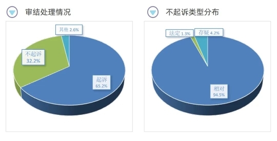 輕罪案件社會(huì)危害性較小、罪責(zé)輕,犯罪嫌疑人認(rèn)罪悔過可能性較大。檢察機(jī)關(guān)在辦理輕罪案件過程中,更加注重貫徹寬嚴(yán)相濟(jì)刑事政策精神,全面落實(shí)認(rèn)罪認(rèn)罰從寬制度,輕罪案件處理趨于寬緩。從認(rèn)罪認(rèn)罰從寬制度適用情況看,2018年以來,輕罪案件認(rèn)罪認(rèn)罰從寬制度的適用率達(dá) 97.4%;從輕罪案件的審結(jié)處理情況來看,2018年至2023年8月,經(jīng)審查作出起訴決定的11852人,起訴率為65.2%;作出不起訴決定5848人,不起訴率為32.2%,其中94.5%為相對(duì)不起訴。