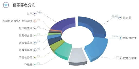 從輕罪案件所涉罪名類型看,海淀區(qū)檢察院受理的輕罪案件涵蓋刑法分則各個(gè)章節(jié),涉及150個(gè)罪名,以傳統(tǒng)自然犯和新型法定犯、經(jīng)濟(jì)犯罪居多。其中,盜竊罪、危險(xiǎn)駕駛罪、故意傷害罪是輕罪案件中人數(shù)排名前三的罪名。具體來說,盜竊罪排名第一位,占比26.2%;自醉駕入刑以來,危險(xiǎn)駕駛罪持續(xù)高發(fā),排名第二位,占比15.5%;隨著生活節(jié)奏加快、社會(huì)關(guān)系更加復(fù)雜,人們由于各種生活摩擦產(chǎn)生的矛盾和糾紛導(dǎo)致的故意傷害類犯罪頻繁發(fā)生,在輕罪案件中排名第三,占比7.9%;另外,自2021年以來,隨著信息化時(shí)代到來以及電信網(wǎng)絡(luò)詐騙犯罪高發(fā),與之相關(guān)的幫助信息網(wǎng)絡(luò)犯罪活動(dòng)罪人數(shù)排名進(jìn)入輕罪案件前十位。
