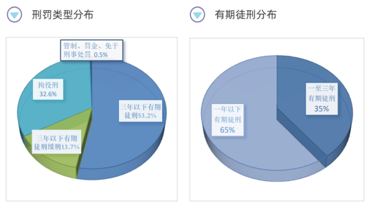 從輕罪案件的刑罰情況看,經(jīng)審判被判處三年以下有期徒刑實(shí)刑的6189人,占比53.2%;判處三年以下有期徒刑緩刑的1598人,占比13.7%;判處拘役刑的3796人,占比32.6%;判處管制、單處罰金和免予刑事處罰的60人,占比0.5%。此外,經(jīng)審判判處三年以下有期徒刑的人中,刑期在一年以下的5065人,占比達(dá)65%。