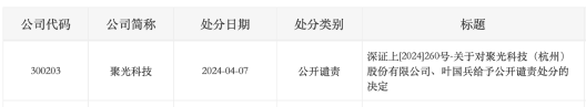 4月7日,據(jù)深交所網(wǎng)站,深交所對聚光科技(杭州)股份有限公司(聚光科技,300203.SZ)及其控股子公司時任總經(jīng)理葉國兵給予公開譴責處分。