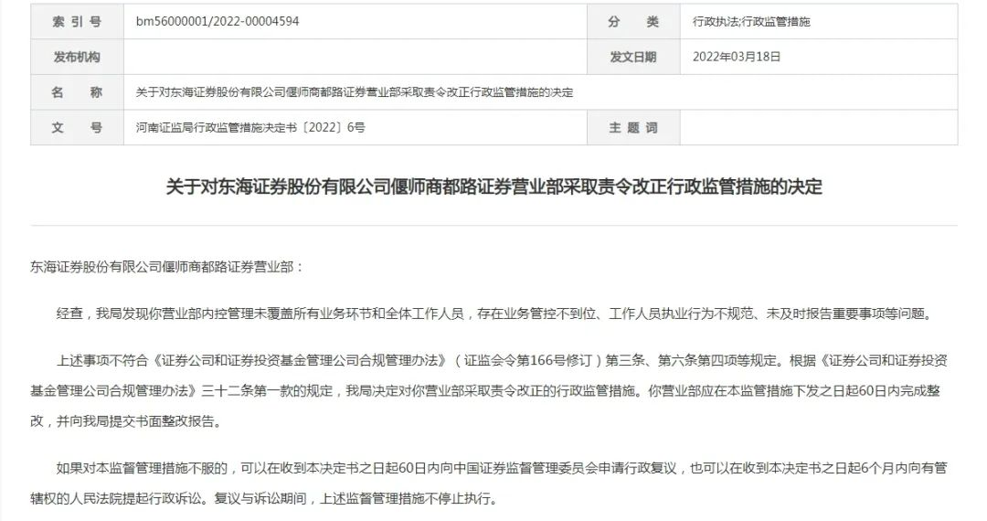 據(jù)公開信息顯示,2022年3月18日,河南監(jiān)管局官網(wǎng)披露,東海證券偃師商都路證券營(yíng)業(yè)部?jī)?nèi)控管理未覆蓋所有業(yè)務(wù)環(huán)節(jié)和全體工作人員,存在業(yè)務(wù)管控不到位、工作人員執(zhí)業(yè)行為不規(guī)范、未及時(shí)報(bào)告重要事項(xiàng)等問(wèn)題。河南監(jiān)管局決定對(duì)該公司偃師商都路證券營(yíng)業(yè)部采取責(zé)令改正的行政監(jiān)管措施,并對(duì)業(yè)部負(fù)責(zé)人高培芳、合規(guī)管理人員王洪波以及員工陳佳佳出具警示函。