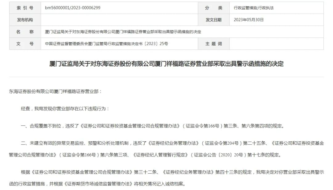 2023年5月30日,廈門證監(jiān)局網(wǎng)站也披露了一則開給東海證券廈門祥福路證券營(yíng)業(yè)部的行政監(jiān)管措施決定書。經(jīng)查,該營(yíng)業(yè)部存在合規(guī)覆蓋不到位,未建立有效的異常交易監(jiān)控、預(yù)警和分析處理機(jī)制等違規(guī)行為。廈門證監(jiān)局決定對(duì)其采取出具警示函的行政監(jiān)管措施,并根據(jù)《證券期貨市場(chǎng)誠(chéng)信監(jiān)督管理辦法》將相關(guān)情況記入誠(chéng)信檔案。此外,2023年2月,東海證券因其在金洲慈航集團(tuán)股份有限公司2015年重大資產(chǎn)重組中,開展獨(dú)立財(cái)務(wù)顧問(wèn)業(yè)務(wù)涉嫌未勤勉盡責(zé),被證監(jiān)會(huì)立案調(diào)查。截至目前,該案件仍處于立案調(diào)查階段。