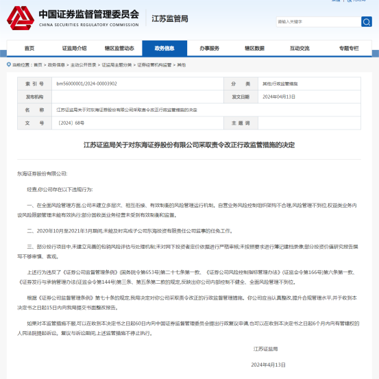 根據(jù)《證券公司監(jiān)督管理?xiàng)l例》第七十條的規(guī)定,江蘇證監(jiān)局決定對(duì)東海證券采取責(zé)令改正的行政監(jiān)督管理措施。同時(shí),該局要求東海證券應(yīng)當(dāng)認(rèn)真整改,提升合規(guī)管理水平,并于收到?jīng)Q定書之日起15日內(nèi)向江蘇證監(jiān)局提交書面整改報(bào)告。