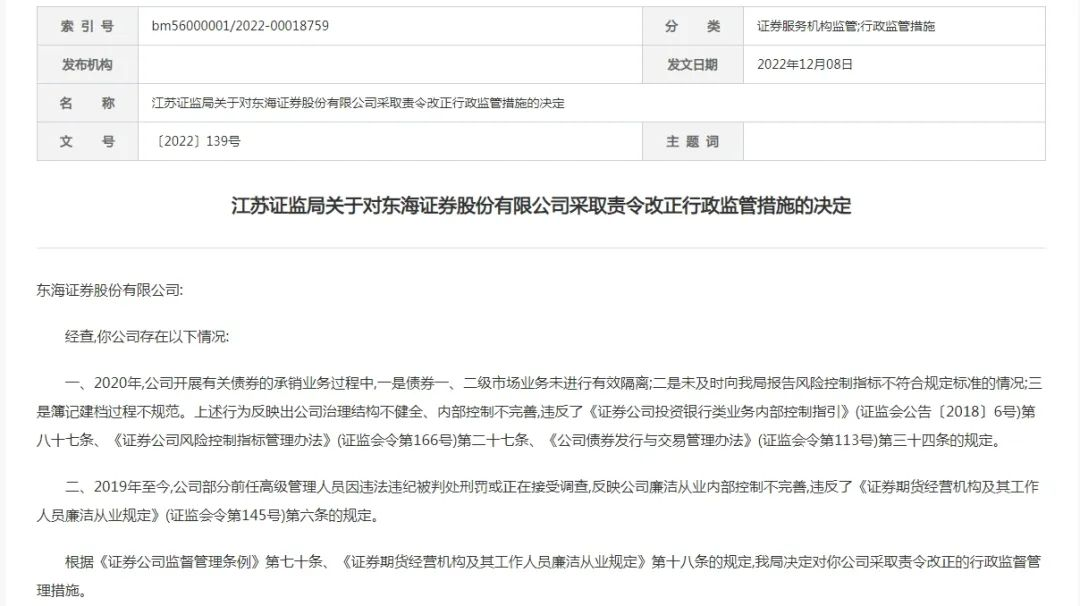 同年12月16日,江蘇證監(jiān)局官網(wǎng)披露,2020年,東海證券在開展有關(guān)債券承銷業(yè)務(wù)過(guò)程中存在治理結(jié)構(gòu)不健全、內(nèi)部控制不完善等問(wèn)題;2019年至今,該公司部分前任高級(jí)管理人員因違法違紀(jì)被判處刑罰或正在接受調(diào)查,反映該公司廉潔從業(yè)內(nèi)部控制不完善。江蘇證監(jiān)局對(duì)該公司采取責(zé)令改正的行政監(jiān)督管理措施,其時(shí)任總裁殷建華、時(shí)任債券發(fā)行部負(fù)責(zé)人許曉明均被警示。