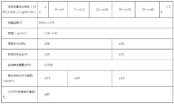 共聚聚甲醛是由甲醛合成的,具有-CH2-O-主鏈及-[CH2-O-CH2-CH2]-嵌鍵(按重量計-CH2-O-含量大于50%)的熱塑性樹脂,且同時滿足以下各項性能指標: