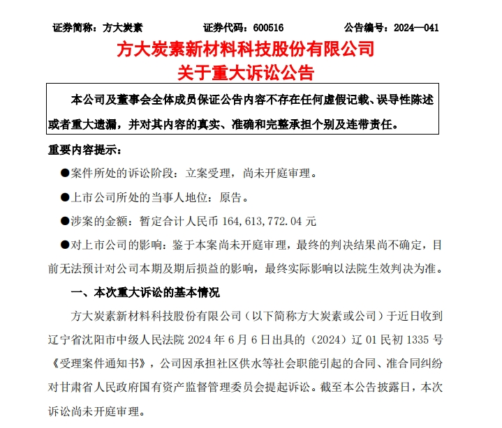 6月11日晚間,方大炭素新材料科技股份有限公司(下稱“方大炭素”)發(fā)布公告稱,公司近日收到遼寧省沈陽市中級(jí)人民法院 2024年6月6日出具的(2024)遼01民初1335號(hào)《受理案件通知書》,公司因承擔(dān)社區(qū)供水等社會(huì)職能引起的合同、準(zhǔn)合同糾紛對(duì)甘肅省人民政府國有資產(chǎn)監(jiān)督管理委員會(huì)提起訴訟。截至本公告披露日,本次訴訟尚未開庭審理。