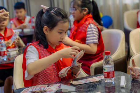 在“點鈔大PK”環(huán)節(jié),支行員工向同學們展示了不同的專業(yè)點鈔手法,并手把手地教授規(guī)范的點鈔動作。孩子們摩拳擦掌、躍躍欲試。隨著一聲令下“開始”,孩子們很快進入了狀態(tài),緊張的呼吸聲伴隨著練功券翻動的聲音,此刻他們仿佛真的成為了“小小銀行家”。