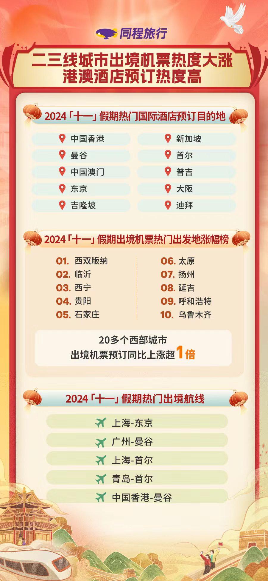 今年“十一”假期,同程旅行平臺國際機票、酒店預訂熱度均呈現(xiàn)大幅上漲趨勢。中國香港、中國澳門憑借大灣區(qū)日益完善的交通條件和便利的通行證辦理政策成為游客出境度假的熱門選擇,進入出境酒店預訂榜單前三。東亞、東南亞城市仍是中國游客出境的熱門選擇,迪拜也進入榜單前十。
