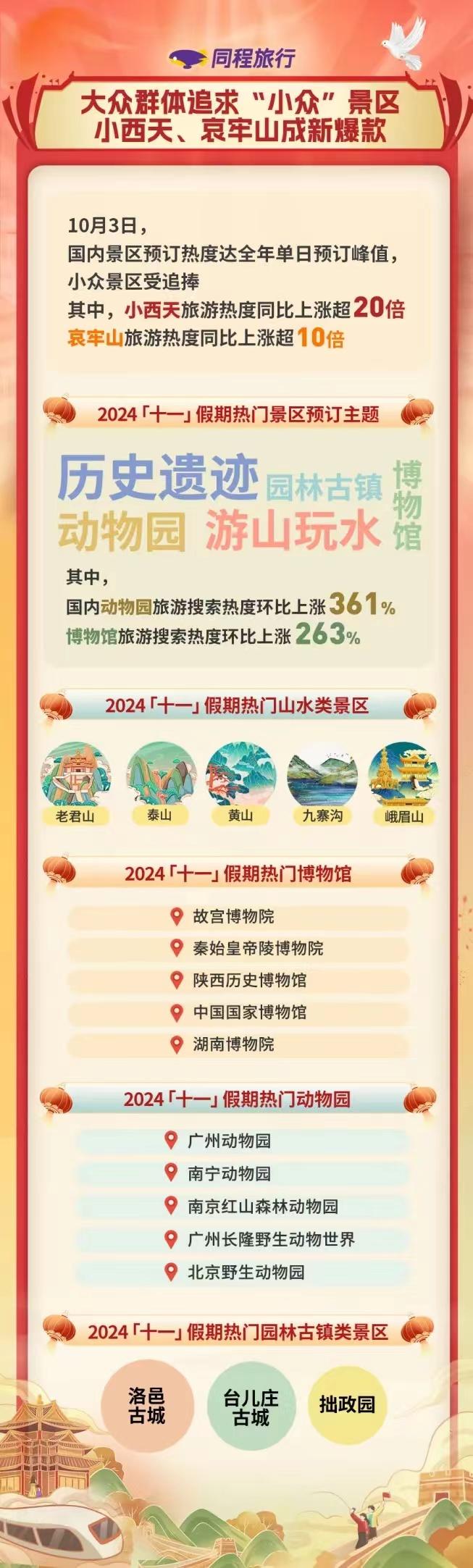 除了這些“小眾”景點外,歷史遺跡、自然山水、動物園、博物館及園林古鎮(zhèn)是今年“十一”假期同程旅行平臺最受歡迎的景區(qū)主題。其中,國內(nèi)動物園的旅游搜索熱度環(huán)比上漲361%,博物館旅游熱度環(huán)比上漲263%。