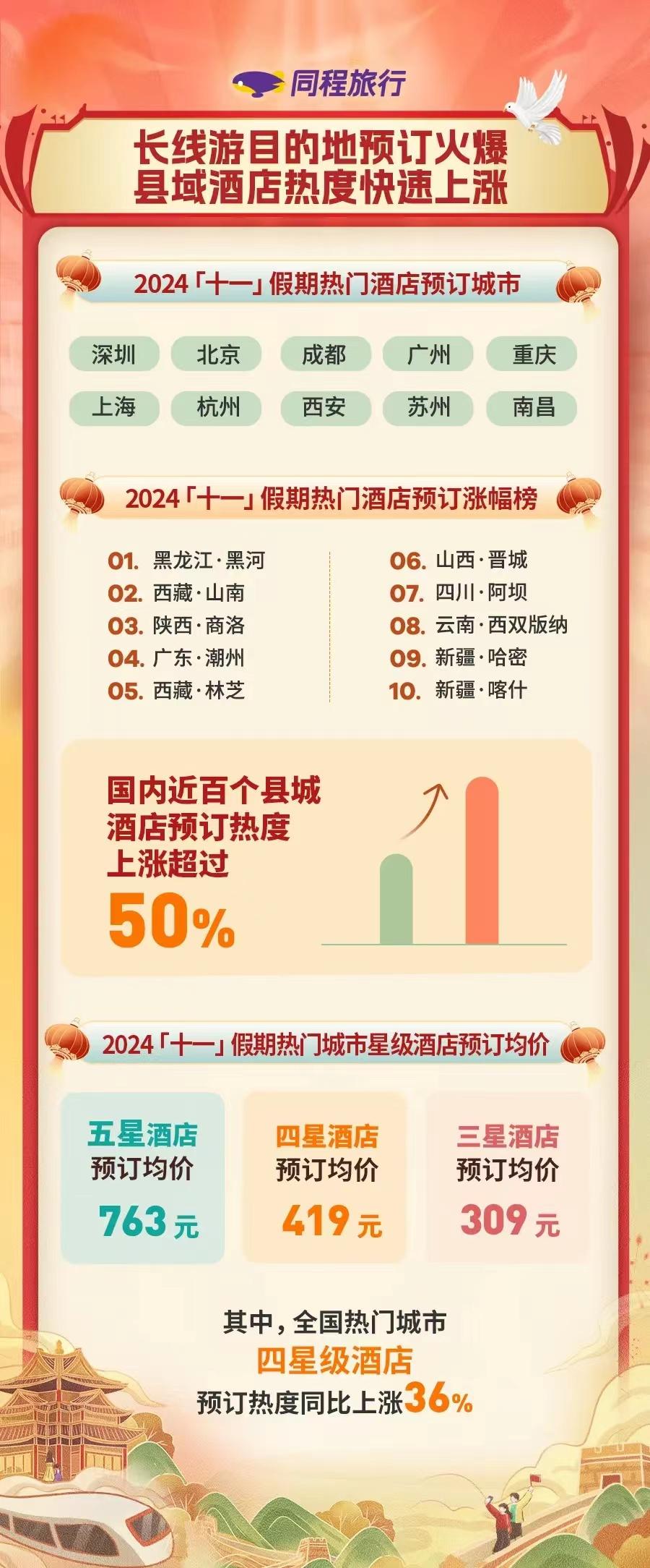 同程旅行數(shù)據(jù)顯示,2024年“十一”假期國內(nèi)各大熱門縣域目的地酒店預訂增速超過大盤。其中,預訂熱度同比漲幅超過50%的縣和縣級市就有近百個。