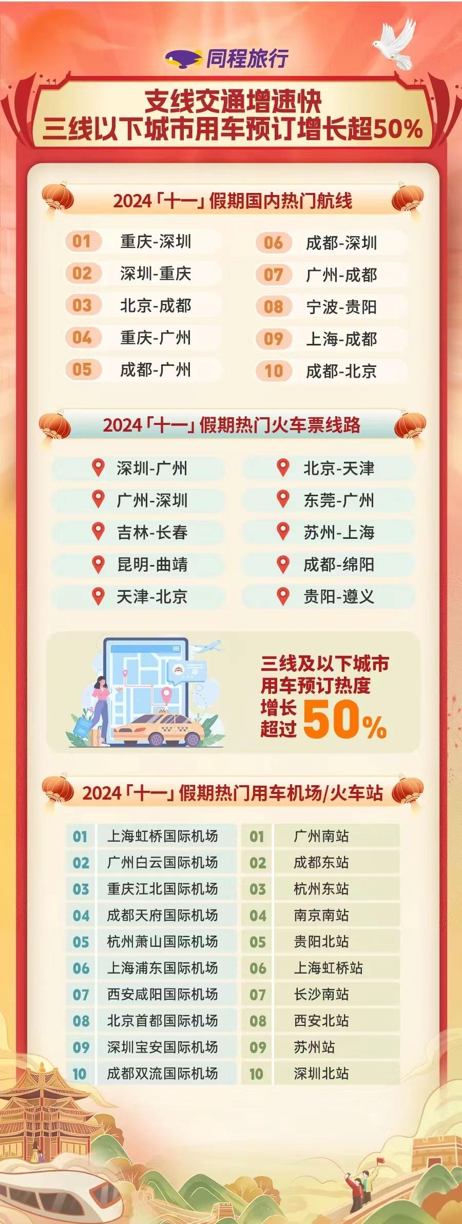 10月7日,同程旅行發(fā)布的《2024“十一”假期旅行消費報告》顯示,2024年“十一”假期,國內(nèi)旅行消費市場持續(xù)增長,二三線及以下城市居民出游消費增長迅速。同程旅行平臺上,三線及以下城市用車預訂熱度增長超過50%;縣城文旅成假期消費亮點,全國近百個縣城酒店預訂熱度同比上漲超過50%。
