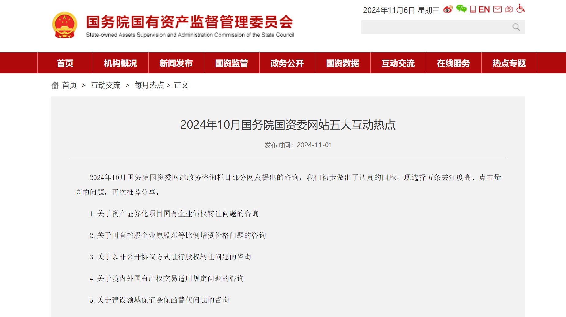 近日,國務(wù)院國資委對(duì)2024年10月官網(wǎng)政務(wù)咨詢欄目部分網(wǎng)友提出的咨詢,初步作出了回應(yīng),并選取了5條關(guān)注度高、點(diǎn)擊量高的問題,再次推薦分享。