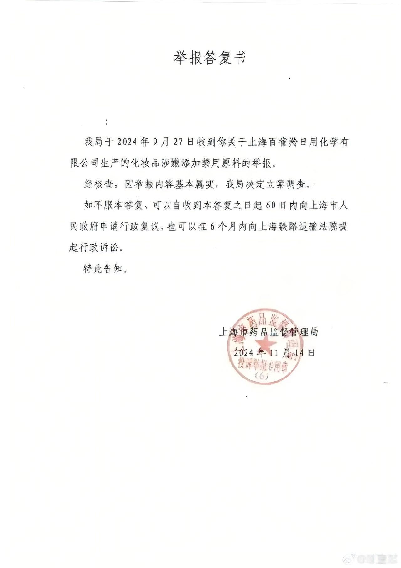 11月19日晚,有博主發(fā)文稱,百雀羚生產(chǎn)的化妝品涉嫌添加禁用原料,同時(shí)貼出了上海市藥監(jiān)局舉報(bào)答復(fù)書。該答復(fù)書蓋有上海市藥監(jiān)局投訴舉報(bào)專用章,其中提到,“經(jīng)核查,因舉報(bào)內(nèi)容基本屬實(shí),我局決定立案調(diào)查?!痹谠撐⒉┌l(fā)布幾個(gè)小時(shí)后,“百雀羚化妝品涉嫌添加禁用原料”相關(guān)話題于11月20日早上登頂熱搜。