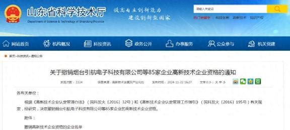 《通知》內(nèi)容顯示,根據(jù)《高新技術(shù)企業(yè)認(rèn)定管理辦法》(國科發(fā)火〔2016〕32號)和《高新技術(shù)企業(yè)認(rèn)定管理工作指引》(國科發(fā)火〔2016〕195號)有關(guān)規(guī)定,經(jīng)研究,決定撤銷煙臺引航電子科技有限公司等85家企業(yè)的高新技術(shù)企業(yè)資格。山東萊鋼永鋒鋼鐵有限公司則列于名單第78位,證書編號GR202237007406,撤銷起始年份為2023年。